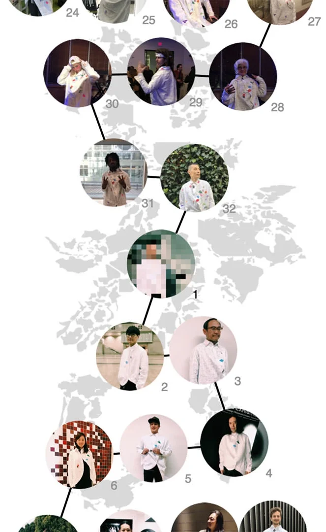 The shirt, designed in the shape of the earth and made of patchworks textile, is worn and passed on to friends like a baton relay. Before passing the garment, the wearer has to leave a mark on the fabric and photograph it for social media.